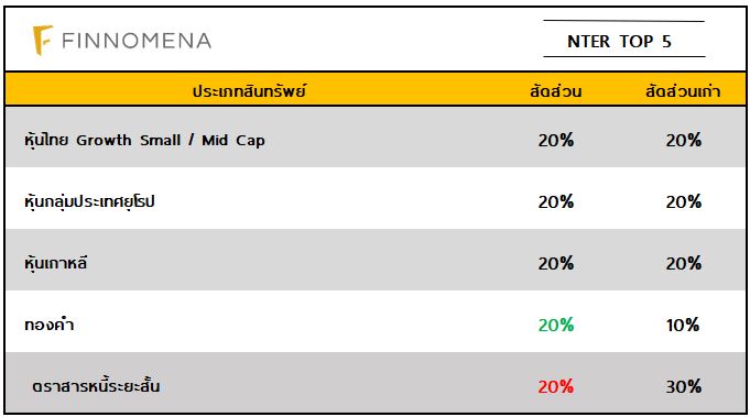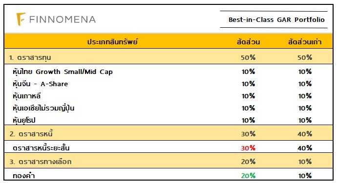 เดือนนี้ FINNOMENA Investment Team แนะนำสัดส่วนการจัดพอร์ตโดยคงสัดส่วนการลงทุนในหุ้น 50% ลดสัดส่วนในกองทุนรวมตราสารหนี้ระยะสั้นเหลือ 30% และเพิ่มสัดส่วนทองคำเป็น 20%