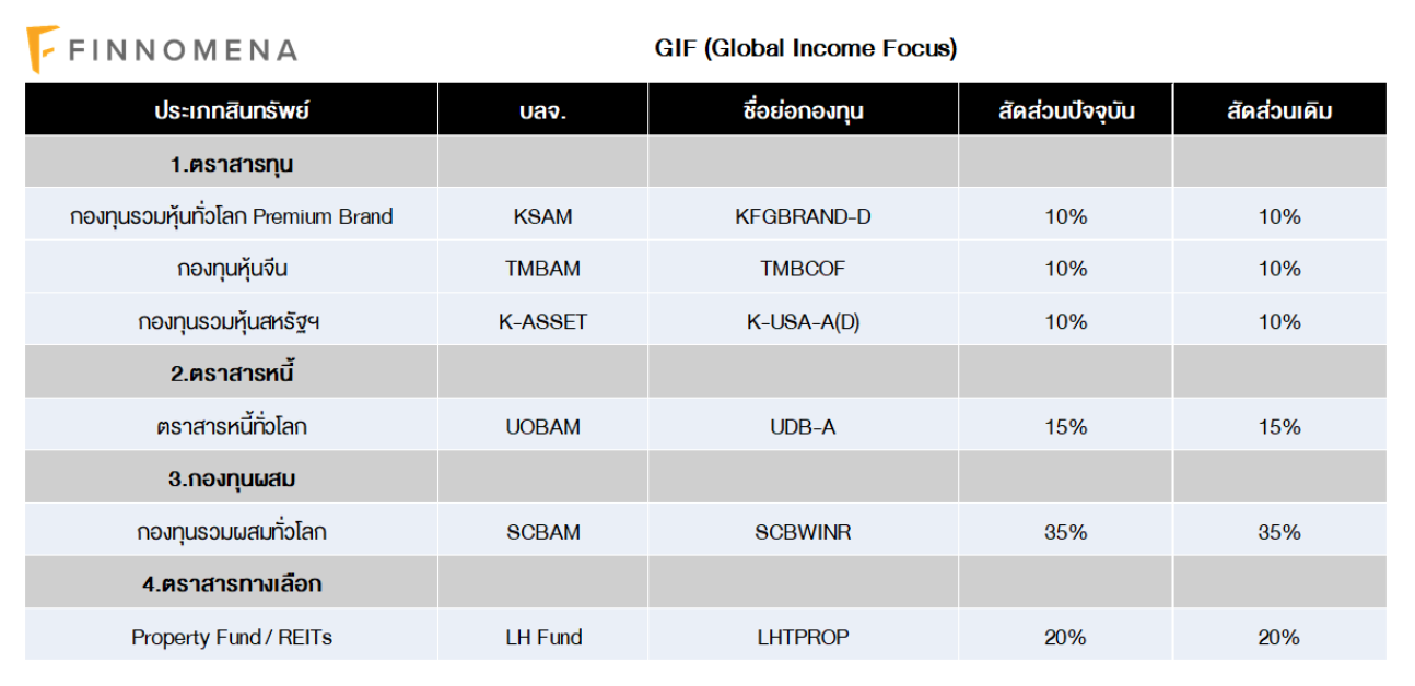 FINNOMENA Investment Team ยังคงแนะนำคงน้ำหนักการลงทุนเดิม เพื่อรับโอกาสสร้างผลตอบแทนด้วยกลุ่มหุ้นผู้นำอย่างสหรัฐฯ ควบคู่ไปกับการควบคุมความเสี่ยงผ่านทางการกระจายการลงทุนในสินทรัพย์ปลอดภัยอย่างตราสารหนี้ พร้อมทั้งความสามารถในการสร้างกระแสเงินสดที่สม่ำเสมอจากการจ่าย Auto Redemption และการจ่ายปันผล ในแต่ละกองทุน