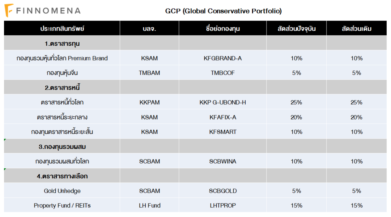 FINNOMENA Investment Team ยังคงแนะนำคงน้ำหนักการลงทุนเดิม โดยเน้นหนักไปที่สินทรัพย์ปลอดภัยจำนวน 70% ของพอร์ตการลงทุน คู่กับการลงทุนในหุ้นทั่วโลกคุณภาพดี 10% และหุ้นในกลุ่ม New Economy จีน เพื่อรับโอกาสสร้างผลตอบแทนได้ใกล้เคียงระดับเป้าหมาย 3-5% ต่อปีในระยะยาว ด้วยความผันผวนในระดับที่ต่ำ