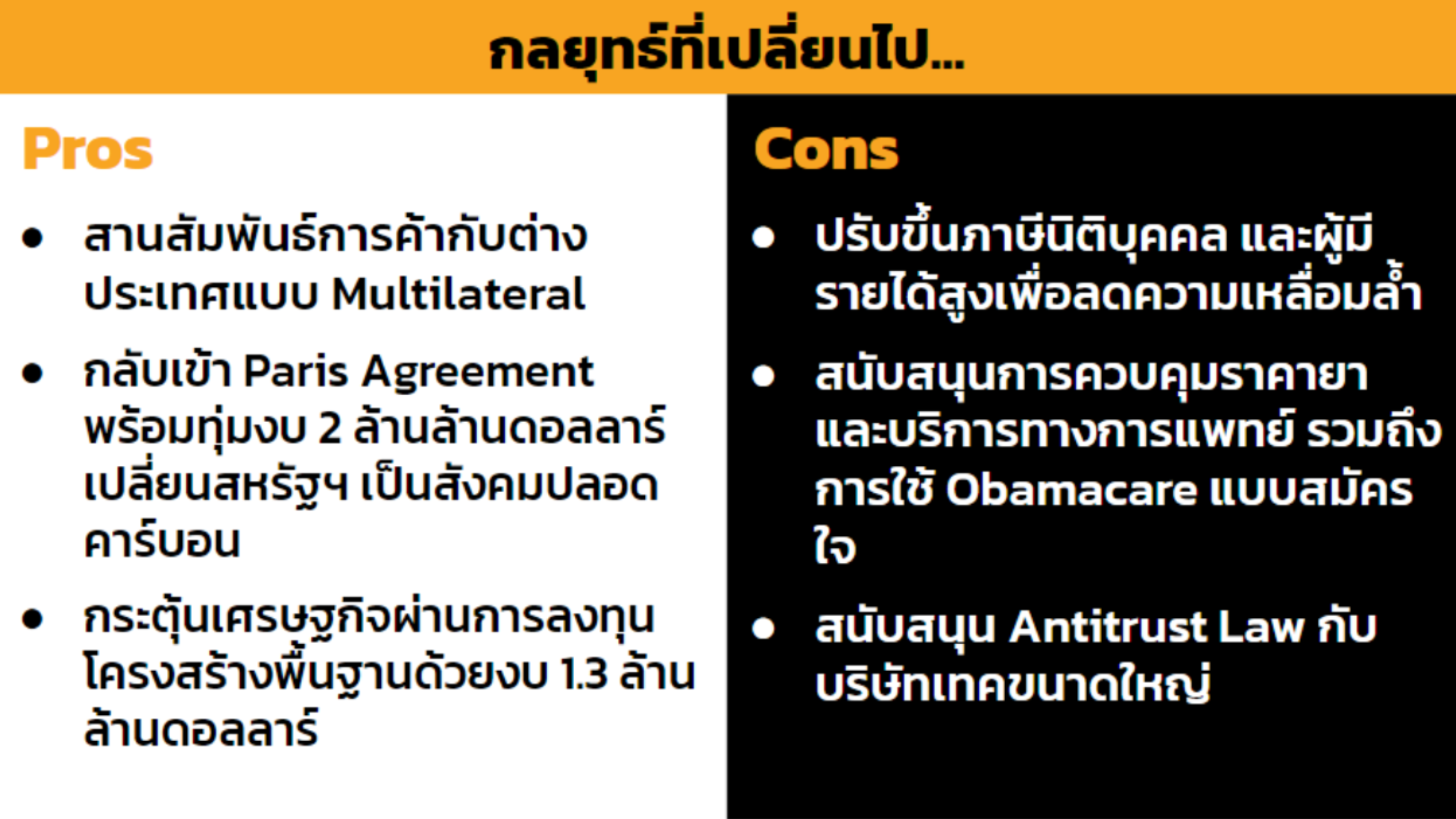 การต่างประเทศแบบ Multilateral จะลดความตึงเครียดระหว่างสหรัฐฯ และจีนทางตรง อีกทั้งยังหนุนประเทศอื่นทั่วโลก เนื่องจากการต่างประเทศรูปแบบดังกล่าวจะเน้นสร้างความร่วมมือ ทำให้ทั้งสหรัฐฯ และจีนต้องเดินเกมส์ข้อตกลงการค้าอย่างเต็มรูปแบบ เช่น ข้อตกลง RCEP และ CPTPP หรืออาจมีข้อตกลงใหม่เกิดขึ้นได้ในอนาคต ซึ่งจะสร้างประโยชน์ต่อการค้าระหว่างประเทศได้ดีกว่านโยบายการต่างประเทศแบบ Bilateral ในยุคของทรัมป์