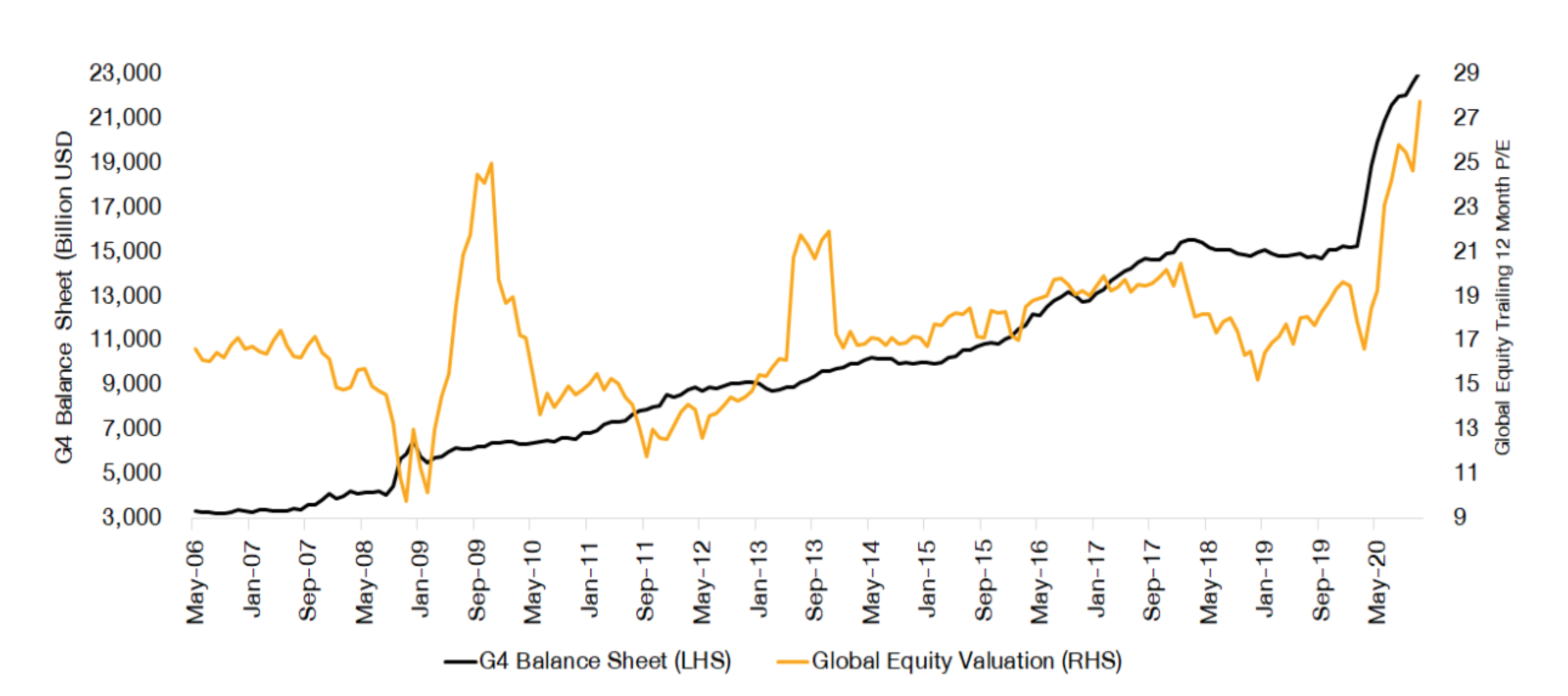ผลทั้งหมดนี้จึงสะท้อนผ่านขนาด Balance sheet ของกลุ่มประเทศ G4 ที่เพิ่มขึ้นราว 8 ล้านล้านดอลลาร์ และสภาพคล่องดังกล่าวได้ไปหนุนสินทรัพย์การเงินทุกชนิดให้ปรับตัวขึ้นในเวลาอันรวดเร็ว นอกจากนั้นตลาดยังคาดว่าธนาคารกลางยังเพิ่มสภาพคล่องเข้าระบบอย่างต่อเนื่องในปี 2021