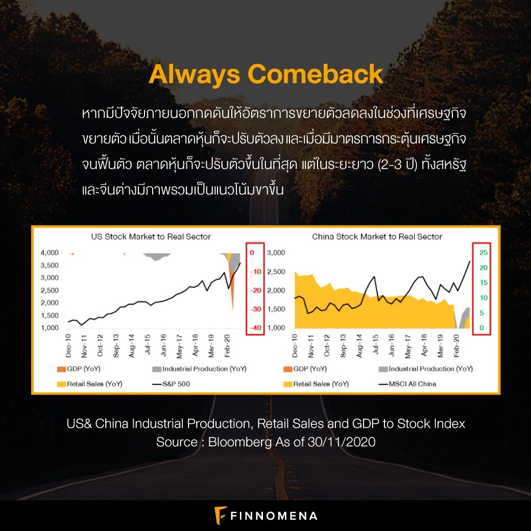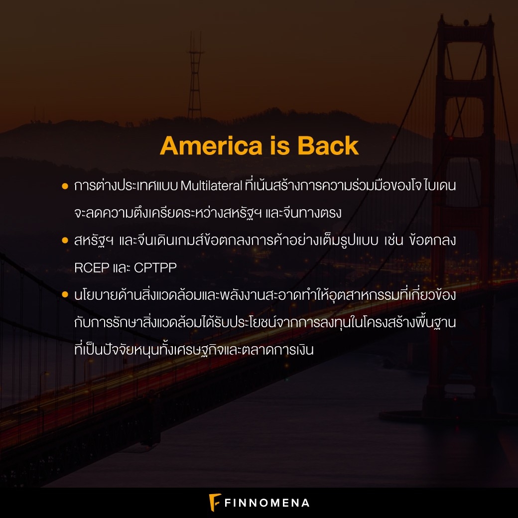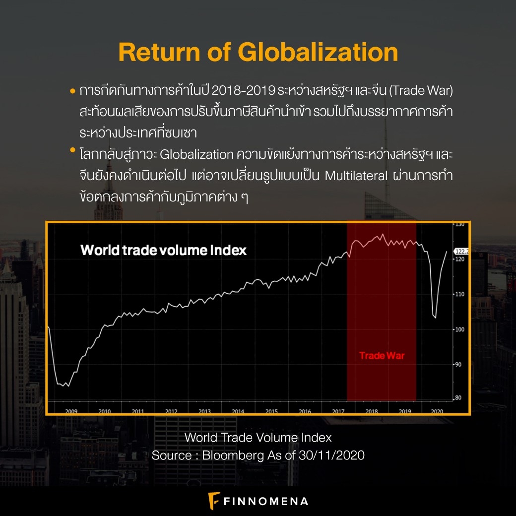 ประกอบกับผลกระทบของ COVID-19 ต่อเศรษฐกิจโลก ทำให้ FINNOMENA Investment Team มีมุมมองว่าทั่วโลกจะกลับไปสู่ภาวะ Globalization แต่ความขัดแย้งประเด็นการค้าระหว่างสหรัฐฯ และจีนยังคงดำเนินต่อไป เพียงแต่อาจเปลี่ยนรูปแบบมาเป็น Multilateral ผ่านการทำข้อตกลงการค้ากับภูมิภาคต่างๆ