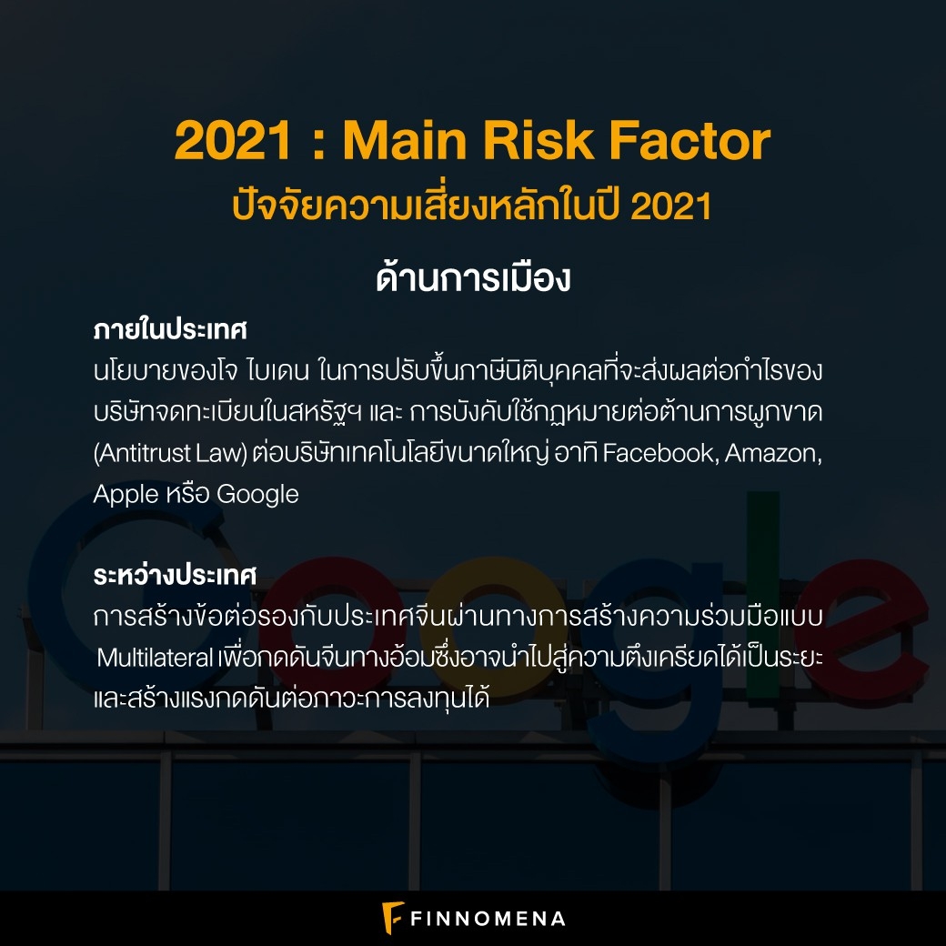 อย่างไรก็ตาม เราอยู่ในโลกแห่งความไม่แน่นอน ดังนั้น ในปี 2021 ยังคงมีความเสี่ยงที่สำคัญคือ การแพร่ระบาดที่ทำให้ยังไม่สามารถเปิดเมืองได้อย่างเต็มที่, การบังคับใช้ Antitrust Law ในสหรัฐฯ และจีน รวมไปถึงการเมืองระหว่างประเทศของสองชาติมหาอำนาจ