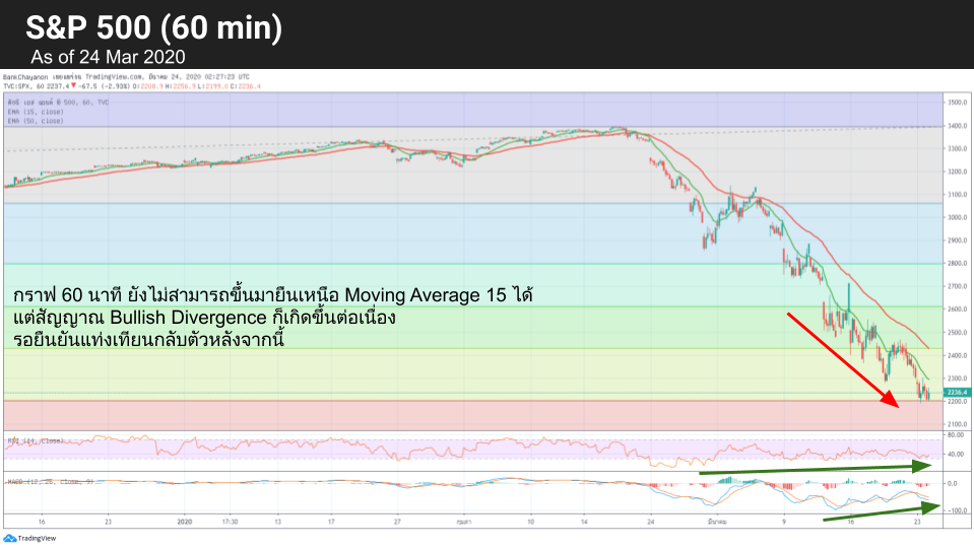 กราฟของดัชนี S&P500 รายชั่วโมง (60min Chart) ยังไม่สามารถขึ้นมายืนเหนือ Moving Average 15 ได้ แต่สัญญาณ Bullish Divergence ก็เกิดขึ้นต่อเนื่อง รอยืนยันแท่งเทียนกลับตัวหลังจากนี้ ก็จะเป็นสัญญาณกลับตัว