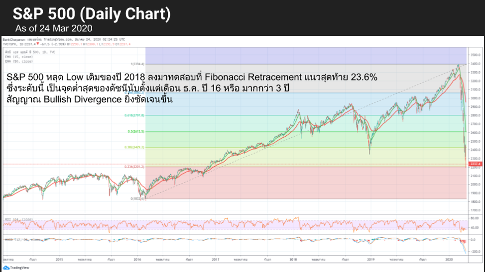 S&P 500 หลุด Low เดิมของปี 2018 ลงมาทดสอบที่ Fibonacci Retracement แนวสุดท้าย 23.6% ซึ่งระดับนี้ เป็นจุดต่ำสุดของดัชนีนับตั้งแต่เดือน ธ.ค. ปี 16 หรือ มากกว่า 3 ปี