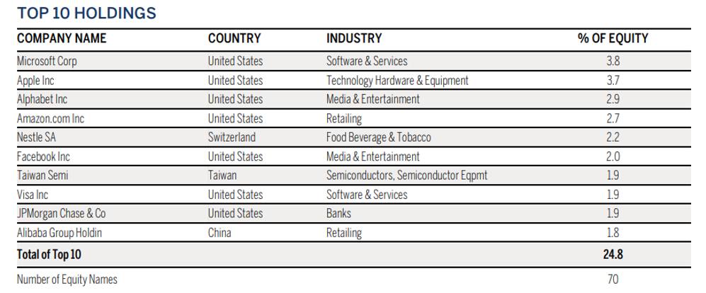 รูปที่ 3 Top 10 Holdings ของกองทุน Wellington Global Quality Growth Fund I Source : Wellingtonfunds.com As of 24/3/2020