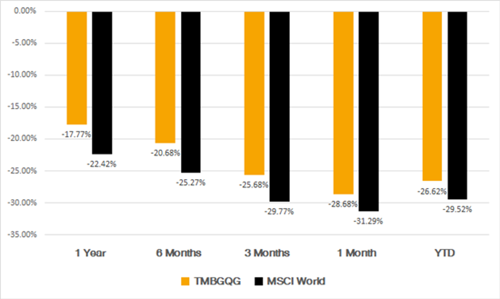 จากการเปรียบเทียบผลตอบแทน พบว่ากองทุน TMBGQG ปรับตัวลงน้อยกว่า MSCI World Index เนื่องจาก