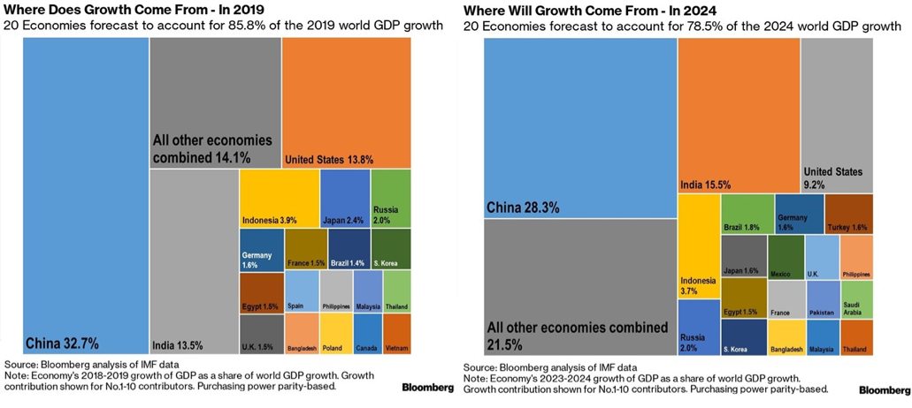 ล่าสุดทาง Bloomberg ได้ทำคาดการณ์ผลของการขยายตัวของเศรษฐกิจแต่ละประเทศต่อการขยายตัวของเศรษฐกิจโลก จะเห็นว่าทั้งปัจจุบันและอนาคตประเทศจีนและอินเดียต่างก้าวขึ้นมาเหนือประเทศอื่นอย่างชัดเจน
