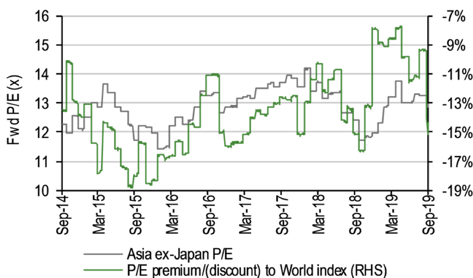 จากรูปที่ 3 ซึ่งทาง Bloomberg ได้รวบรวมคาดการณ์ทั้งกำไรต่อหุ้น (EPS) และอัตราการเติบโตของกำไรต่อหุ้น (EPS Growth) พบว่า ณ ตอนนี้นักวิเคราะห์คาดว่าในปีหน้ากำไรต่อหุ้น (EPS) ของภูมิภาคเอเชียยกเว้นญี่ปุ่น (Asia ex-Japan) จะขยายตัวที่ 13.91% (YoY) หากประกอบกับมูลค่าโดยใช้คาดการณ์อัตราส่วนราคาต่อกำไร (Forward P/E ratio) ซึ่งอยู่ที่ประมาณ 12 เท่า โดยจากรูปที่ 4 ได้เพิ่มเติมข้อมูลด้วยการเปรียบเทียบส่วนเพิ่ม (Premium) และส่วนลด (Discount) เมื่อเทียบกับดัชนีหุ้นโลก ในแกนขวามือ (RHS) ก็จะเห็นว่ามีส่วนลดประมาณ 15% ซึ่งนับว่าเป็นภูมิภาคที่น่าสนใจทั้งในแง่การเติบโต และอัตราการขยายตัว