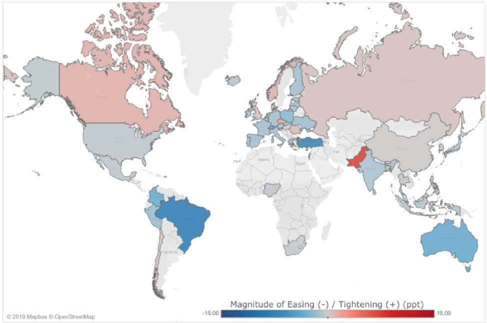 รูปที่ 5 ความตีงตัวหรือผ่อนคลายนโยบายทางการเงินของแต่ละประเทศทั่วโลก (Tightening / Easing Monetary Policy) I Source : cfr.org as of 22/10/2019