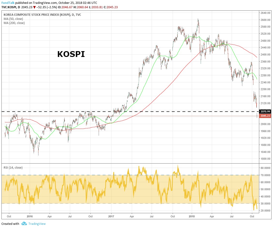 ในส่วนของตลาดหุ้นเกาหลี แม้ในต้นเดือนตุลาคมที่ผ่านมาจะมีสัญญาณซื้อจาก MACD ระดับสัปดาห์ แต่ล่าสุดประกาศ GDP ไตรมาส 3/1 ออกมาต่ำกว่าที่คาดการณ์ที่ 2.0% ขณะที่ตลาดหุ้นได้รับผลกระทบค่อนข้างมากเนื่องจากได้รับ sentiment เชิงลบมาจากการปรับตัวลดลงของ NASDAQ
