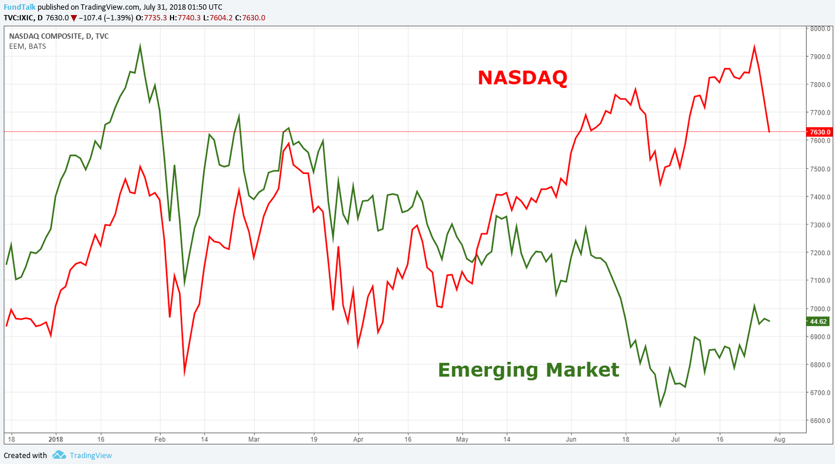 รูปที่ 2 ดัชนี NASDAQ เปรียบเทียบ Emerging Markets | ที่มา Tradingview (As of 30/7/18)