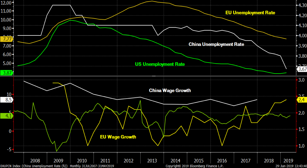รูปที่ 10 อัตราการว่างงานและอัตราการขยายของค่าจ้าง สหรัฐฯ, จีน และ สหภาพยุโรป l Source : Bloomberg