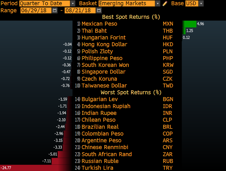 รูปที่ 1 การเปลี่ยนแปลงของค่าเงินตลาดเกิดใหม่ในไตรมาส 3/61 | ที่มา Bloomberg (as of 21/8/18)