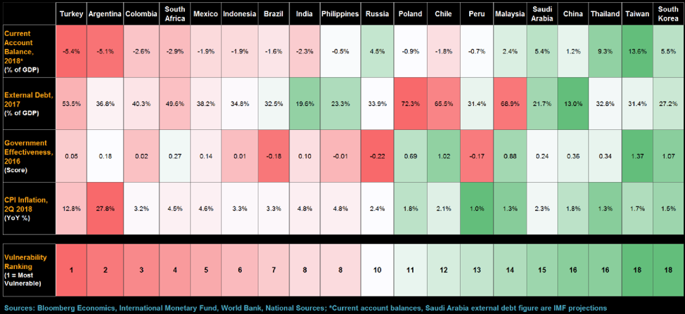 รูปที่ 2. ตารางดัชนีชี้วัดความแข็งแกร่งของตลาดเกิดใหม่ | ที่มา : Bloomberg Economics (as of 21/8/18)