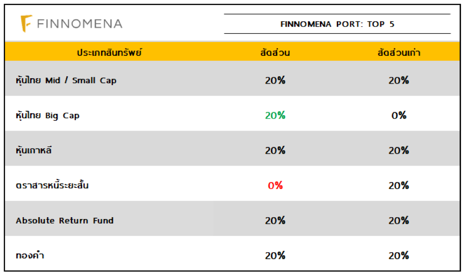 สำหรับพอร์ต TOP5 FINNOMENA Investment Team แนะนำให้เพิ่มสัดส่วนการลงทุนในหุ้นไทย Big Cap เพิ่มขึ้น 20% ของพอร์ตการลงทุนเช่นกัน