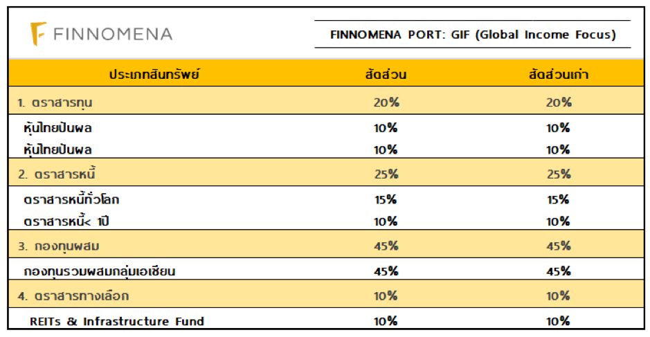 สำหรับโมเดลพอร์ต GIF FINNOMENA Investment Team ไม่มีการเปลี่ยนแปลงพอร์ตแนะนำในเดือนนี้