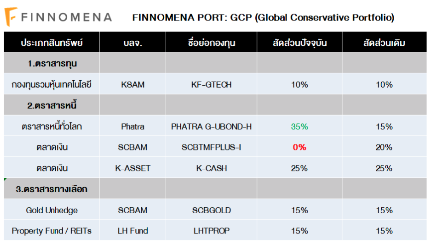 FINNOMENA Investment Team แนะนำเพิ่มน้ำหนักการลงทุนในกองทุน PHATRA G-UBOND-H 20% สู่ระดับ 35% เพื่อรับโอกาสสร้างผลตอบแทนจากตราสารหนี้ระยะกลาง ซึ่งได้รับผลเชิงบวกจากการเสริมสภาพคล่องของ Fed และ Credit Spread ที่ยังอยู่ในระดับที่สูงกว่าค่าเฉลี่ย เพื่อให้พอร์ตการลงทุนโดยรวมสามารถสร้างผลตอบแทนได้ใกล้เคียงระดับเป้าหมาย 3-5% ต่อปีในระยะยาว