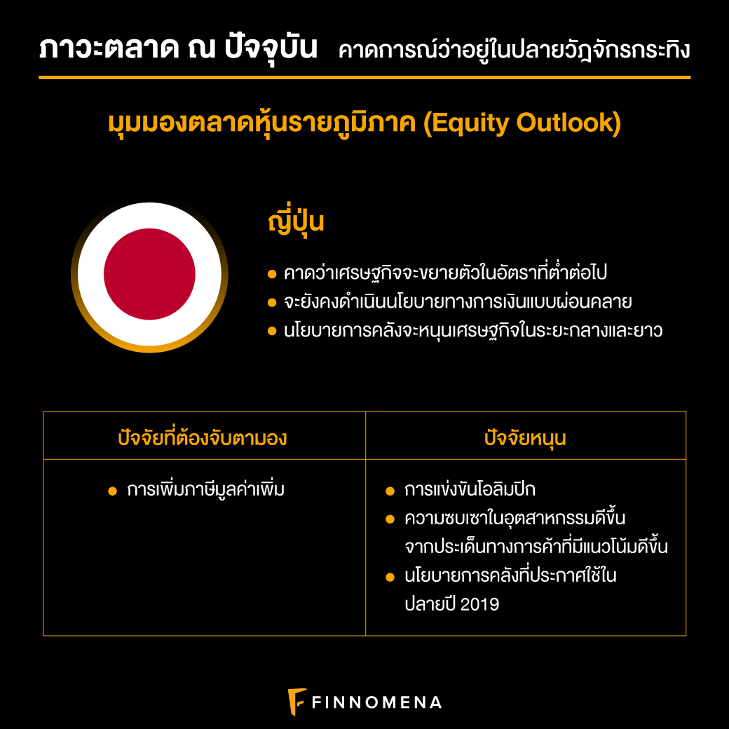 เรายังคาดว่าเศรษฐกิจญี่ปุ่นจะขยายตัวในอัตราที่ต่ำต่อไป แต่ความซบเซาในภาคอุตสาหกรรมจะลดลงหลังประเด็นการค้าเริ่มมีแนวโน้มในทางที่ดีขึ้น อย่างไรก็ตามการปรับขึ้นอัตราภาษีมูลค่าเพิ่มจะชะลอการขยายตัวของเศรษฐกิจอย่างแน่นอน ขณะเดียวกันการแข่งขันโอลิมปิก 2020 และนโยบายการคลังที่ประกาศใช้ในช่วงปลายปี 2019 จะเป็นปัจจัยบวกที่ช่วยลดผลกระทบจากประเด็นการค้าและการขึ้นภาษีมูลค่าเพิ่ม