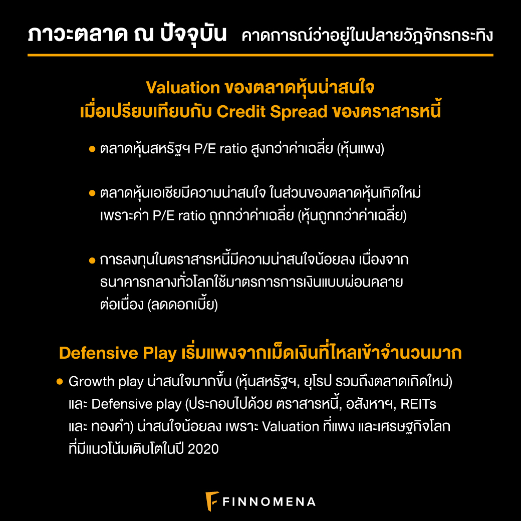 หากแบ่งประเภทของการลงทุนออกเป็น 2 ประเภท ได้แก่ Growth Play (หุ้นสหรัฐฯ, ยุโรป รวมถึงตลาดเกิดใหม่) และ Defensive Play (ประกอบไปด้วย ตราสารหนี้, อสังหาฯ, REITs และ ทองคำ) จะพบว่า นับตั้งแต่ไตรมาส 3/2018 จนถึงปัจจุบัน เงินทุนไหลเข้าไปลงทุนใน Defensive Play จนมูลค่าสูงจุดนับตั้งแต่ปี 1983 ซึ่งสะท้อนว่านักลงทุนมีมุมมองกลัวความเสี่ยงในรอง 18 เดือนที่ผ่านมาจนทำให้สินทรัพย์ประเภท Defensive Play เริ่มมีความเสี่ยงมากขึ้นจาก Valuation ที่แพง ในขณะที่สถานการณ์เศรษฐกิจโลกในปี 2020 มีแนวโน้มจะเติบโตต่อทำให้การลงทุนแบบ Growth Play น่าสนใจมากขึ้น