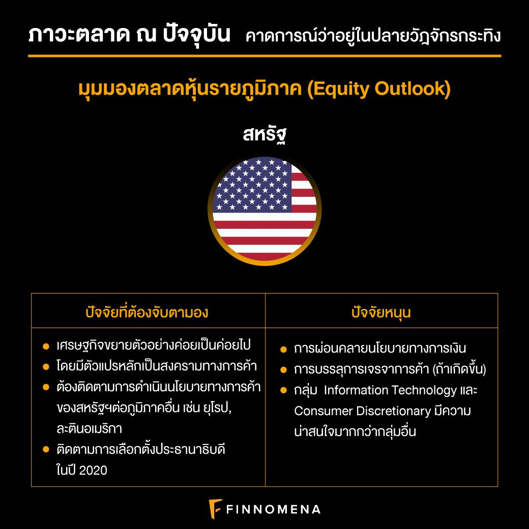 อย่างไรก็ตาม การผ่อนคลายนโยบายการเงินของธนาคารกลางสหรัฐฯ (Fed) รวมทั้งตลาดแรงงานที่แข็งแกร่งอย่างต่อเนื่อง จะเป็นปัจจัยที่หนุนการบริโภคภายในซึ่งเป็นภาคส่วนหลักต่อการเติบโตของเศรษฐกิจสหรัฐฯ โดยมีสัดส่วนถึง 60% ของ GDP ประเทศสหรัฐฯ  ดังนั้นหากสามารถบรรลุข้อตกลงการเจรจาการค้าได้ ก็จะเป็นอีกปัจจัยที่เกื้อหนุนทั้งรายได้และการลงทุนโดยเฉพาะภาคอุตสาหกรรมที่ซบเซามาตั้งแต่ต้นปี 2018 ทั้งนี้เราชื่นชอบกลุ่ม Information Technology และ Consumer Discretionary มากกว่ากลุ่มอื่นโดยเปรียบเทียบ
