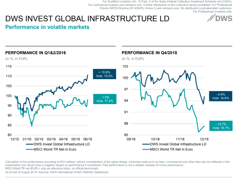 รูปที่ 2 ผลการดำเนินงาน และความผันผวนของกองทุน DWS Invest Global Infrastructure และผลตอบแทนดัชนี MSCI World TR (Euro) ปี 2015 – 2016 และ 2018 I Source : DWS as of 8/10/2019
