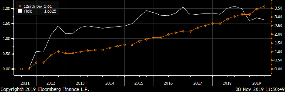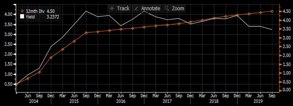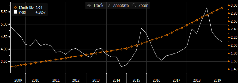 รูปที่ 9 เงินปันผลต่อหุ้น (สีส้ม) และอัตราการปันผลของ (สีขาว) I Source : Bloomberg as of 8/11/2019