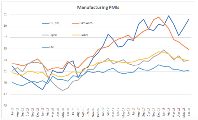 PMIs หรือดัชนีผู้จัดการฝ่ายจัดซื้อ ซึ่งสะท้อนการคาดการณ์ล่วงหน้าถึงการเติบโตทางเศรษฐกิจในช่วง 6-12 เดือนข้างหน้า ผ่านทางมุมมองการสั่งซื้อสินค้าคงคลังของผู้จัดการฝ่ายจัดซื้อ ทั่วโลกยังมีการขยายตัว ซึ่งแสดงออกผ่านการยืนอยู่เหนือระดับ 50 จุด แต่มีแนวโน้มลดลงต่อเนื่อง ทั้งญี่ปุ่น ยุโรป และตลาดเกิดใหม่ ยกเว้นสหรัฐฯ ที่มีแนวโน้มที่ดีขึ้น