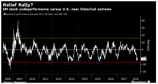 กราฟข้างต้นคือการเปรียบเทียบกันระหว่างผลการดำเนินงานของตลาดหุ้นในตลาดเกิดใหม่ และดัชนี S&P 500 ซึ่งนับตั้งแต่ต้นปีตลาดเกิดใหม่มีความผันผวนสูง ส่งผลให้กราฟที่ออกมาเป็นติดลบลดลงเรื่อย ๆ แต่จากสถิติพบว่า เมื่อผลการดำเนินงานของตลาดเกิดใหม่นั้นแย่ถึงระดับหนึ่ง มักมีการกลับตัวเกิดขึ้น