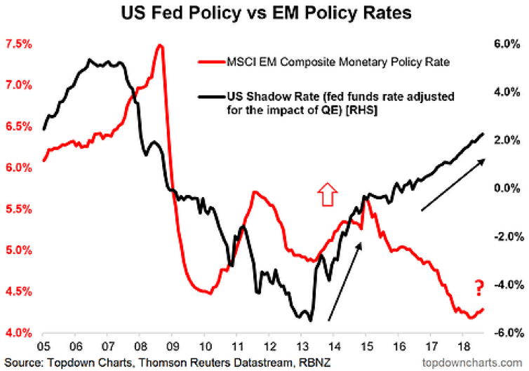ธนาคารกลางกลุ่มประเทศเกิดใหม่มีแนวโน้มปรับดอกเบี้ยขึ้นอย่างต่อเนื่อง ตามทิศทางดอกเบี้ยสหรัฐ เพื่อสกัดเงินลงทุนไหลกลับไปลงทุนในสหรัฐฯ ซึ่งส่งผลให้ค่าเงินในสกุลตลาดเกิดใหม่ปรับตัวอ่อนค่าลง หนี้สินในสกุลดอลลาร์สหรัฐฯ มีมูลค่าสูงขึ้นเมื่อเทียบกับสกุลเงินท้องถิ่น นักลงทุนกังวลต่อความเสี่ยงการผิดนัดชำระหนี้ ดังนั้นกระแสเงินจึงยังคงไหลออกจากกลุ่มประเทศตลาดเกิดใหม่อย่างต่อเนื่อง เพื่อหลีกเลี่ยงความเสี่ยงดังกล่าว