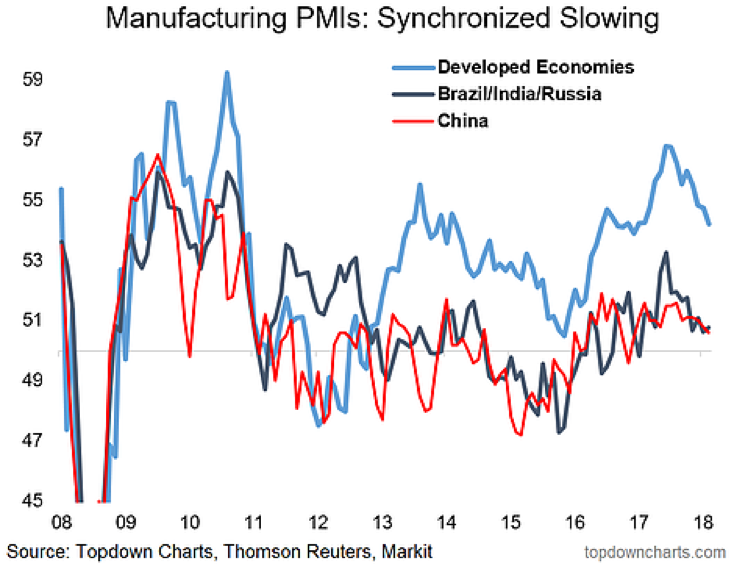 ดัชนี Manufacturing PMI ซึ่งเป็นการสำรวจมุมมองการสั่งซื้อสินค้าและวัตถุดิบในอนาคต ของผู้จัดการฝ่ายจัดซื้อบริษัทภาคการผลิต ทั้งของกลุ่มประเทศพัฒนาแล้ว ที่ได้รับผลกระทบจากสงครามการค้าต่ำ ดัชนีของประเทศจีน และดัชนีของกลุ่มประเทศรัสเซีย อินเดีย บราซิล ซึ่งเป็นกลุ่มประเทศที่มีขนาดเศรษฐกิจใหญ่ในกลุ่มตลาดเกิดใหม่ยังมีแนวโน้มลดลงต่อเนื่อง แต่ยังยืนเหนือระดับ 50 จุด บ่งบอกอัตราการขยายตัวที่ยังคงขยายตัวแต่ในอัตราที่ลดลง ทำให้ภาพรวมการขยายตัวของเศรษฐกิจในอนาคตระยะ 6-12 เดือนข้างหน้า อาจมีการชะลอตัว ส่งผลต่อการปรับตัวขึ้นของตลาด