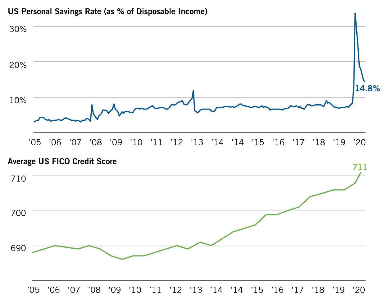 เศรษฐกิจสหรัฐฯ แสดงให้เห็นแล้วว่ามันสามารถฟื้นตัวจากวิกฤตเศรษฐกิจได้อย่างน่าทึ่ง แม้ต้องประสบกับภาวะเศรษฐกิจตกต่ำจาก COVID-19 หลังจากที่สหรัฐฯ สั่งล็อคดาวน์ไปเมื่อช่วงต้นปี 2020 ในตอนนี้กลุ่มผู้บริโภคก็กลับมาใช้จ่ายอีกครั้ง ซึ่งก่อให้เกิดการฟื้นตัวแบบ v-shape ทั้งใน GDP และอัตราการจ้างงาน นโยบายช่วยเหลือทางการคลังและการเงินได้รับการพิสูจน์แล้วว่าเป็นสิ่งที่สำคัญมาก และจะยังคงมีประโยชน์มากขี้นเรื่อย ๆ ด้วยอัตราเงินออมส่วนบุคคลที่ยังอยู่ในเกณฑ์ที่สูงเกือบถึง 15% รวมถึงสถานะทางสินเชื่อของหลาย ๆ ครัวเรือนต่างมีคะแนนเครดิตที่สูงตั้งแต่มีการเริ่มเก็บข้อมูลในปี 2005 สิ่งเหล่านี้ดูเหมือนจะเป็นเชื้อเพลิงชั้นดีสำหรับกำลังในการจับจ่ายใช้สอยในอนาคต