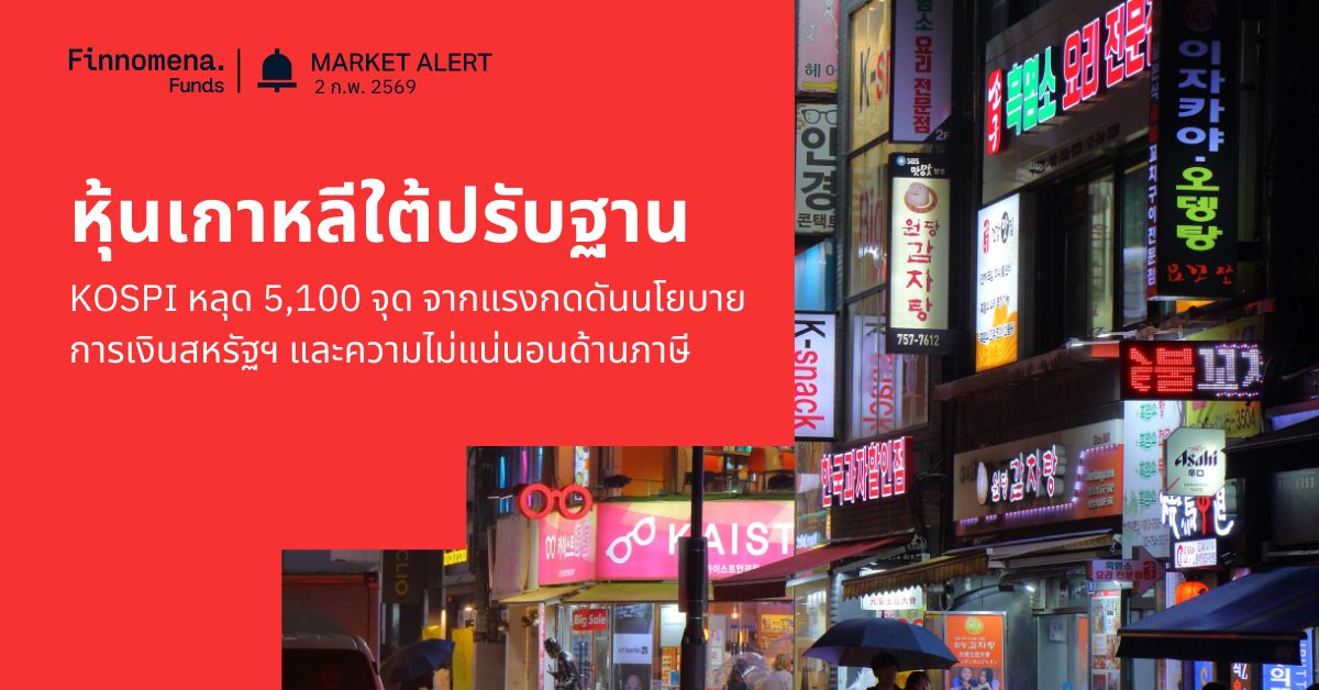วันที่ 2 กุมภาพันธ์ 2026 ดัชนี KOSPI ปรับตัวลงมากกว่า -2% ระหว่างการซื้อขายช่วงเช้า มาอยู่บริเวณ ต่ำกว่า 5,100 จุด ถือเป็นการยุติการปรับตัวขึ้นทำสถิติใหม่ในช่วงก่อนหน้า โดยเป็นครั้งแรกที่ดัชนีหลุดระดับดังกล่าวนับตั้งแต่ปลายเดือนมกราคม สะท้อนการกลับมาอยู่ในโหมดลดความเสี่ยงของนักลงทุน ท่ามกลาง Sentiment เชิงลบจากตลาดโลก