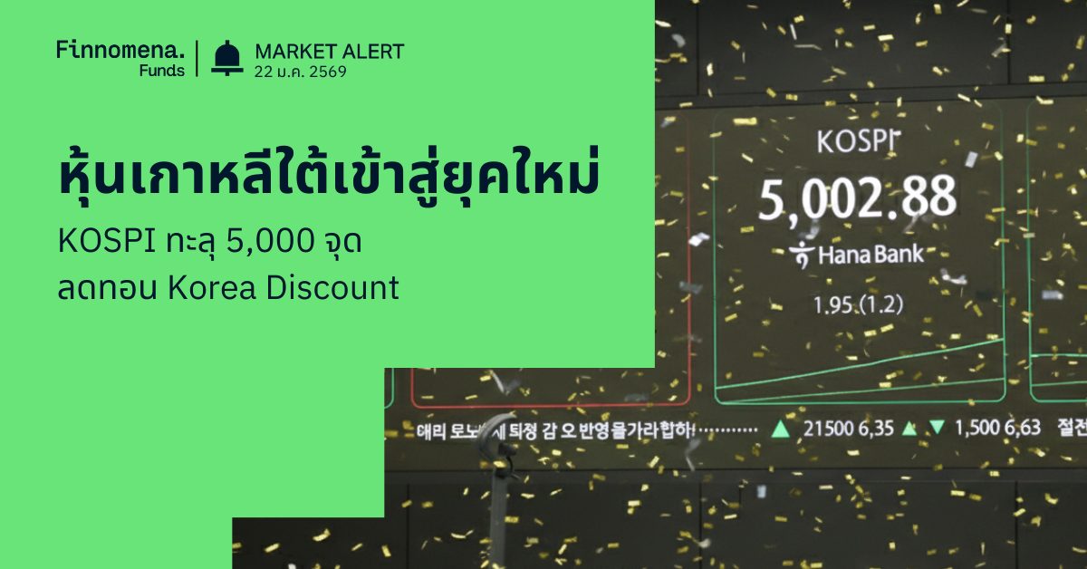 วันที่ 22 มกราคม 2026 ดัชนี KOSPI ปรับตัวขึ้นเกือบ +2.0% ทะลุระดับ 5,000 จุด เป็นครั้งแรกในประวัติศาสตร์ โดยระหว่างวันขึ้นไปทำจุดสูงสุดบริเวณ 5,019 จุด สะท้อนแรงซื้อที่กลับมาอย่างแข็งแกร่งตั้งแต่ช่วงเปิดตลาด และสร้างความคาดหวังว่าปรากฏการณ์ “Korea Discount” ซึ่งกด Valuation ของตลาดหุ้นเกาหลีใต้มายาวนาน อาจเริ่มคลี่คลายลงอย่างมีนัยสำคัญ