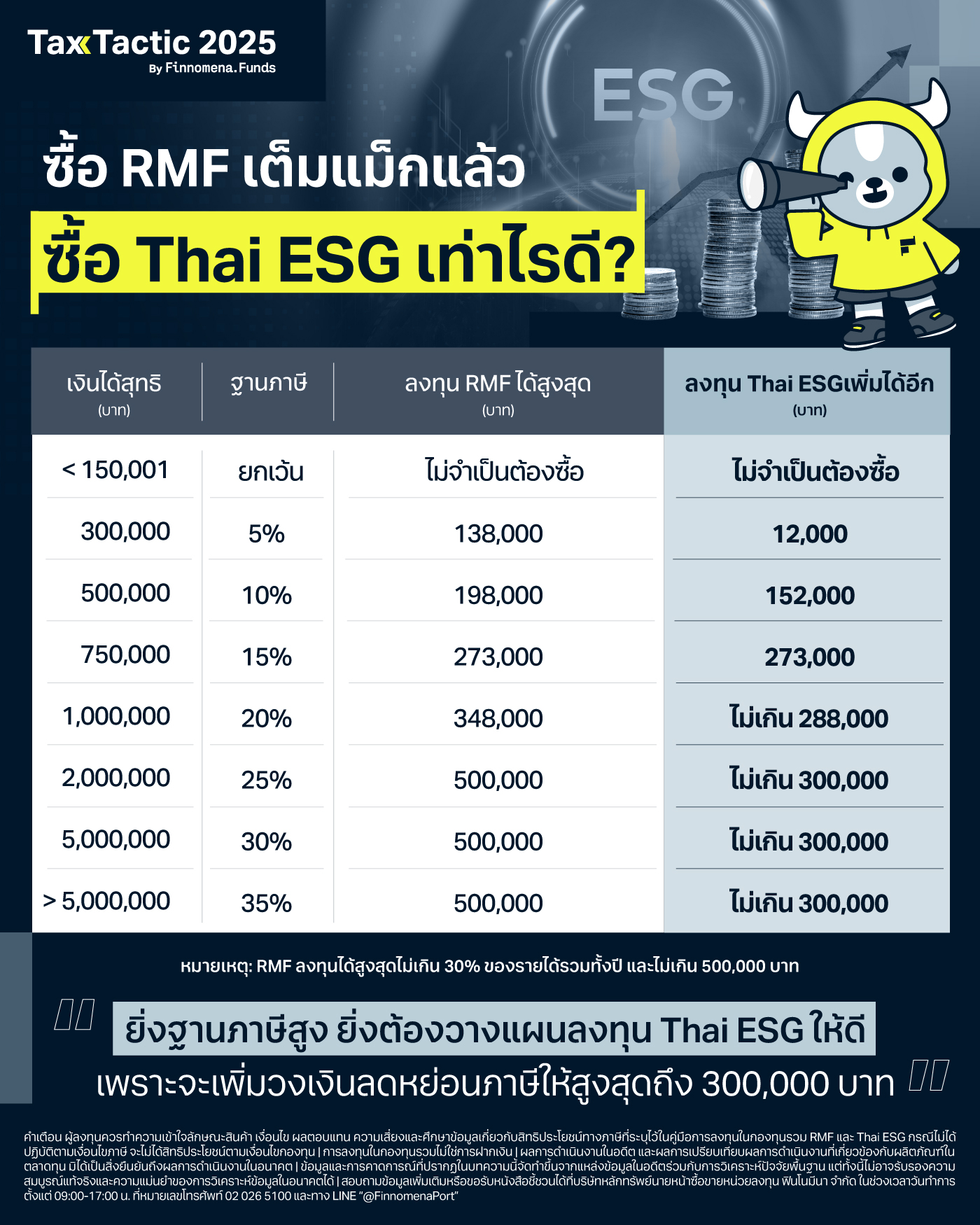 - เงินเดือน 25,000 บาท รายได้รวมทั้งปี 300,000 บาท ซื้อ Thai ESG ได้สูงสุด 90,000 บาท