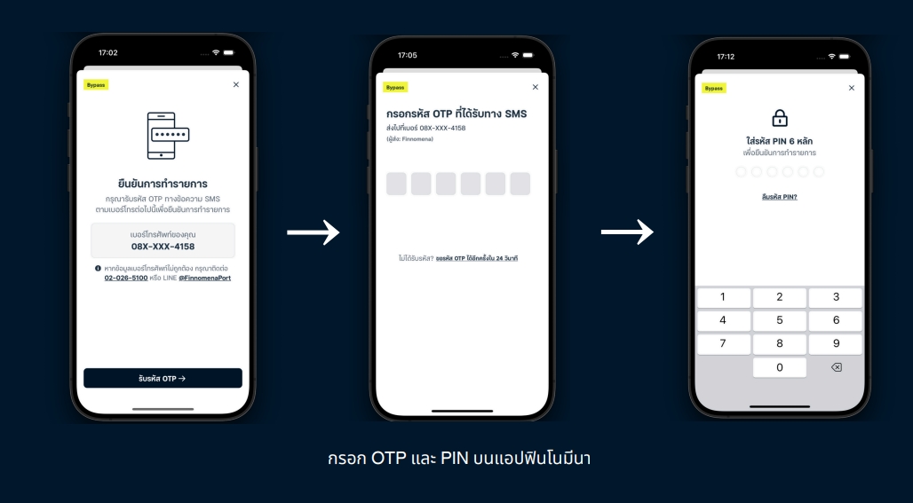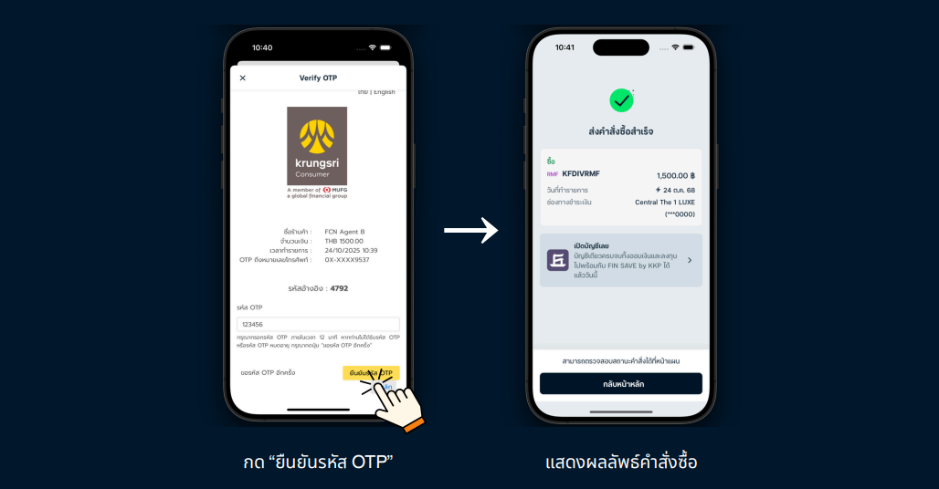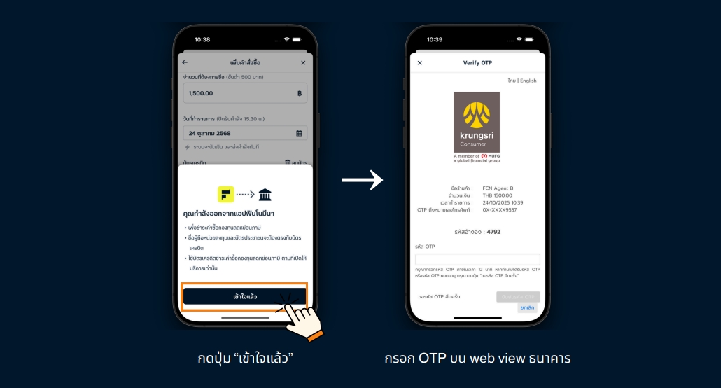 4. กรอกรหัส OTP และ PIN บนแอป Finnomena จากนั้นกดปุ่ม “เข้าใจแล้ว” และกรอกรหัส OTP บน Webview ของธนาคาร