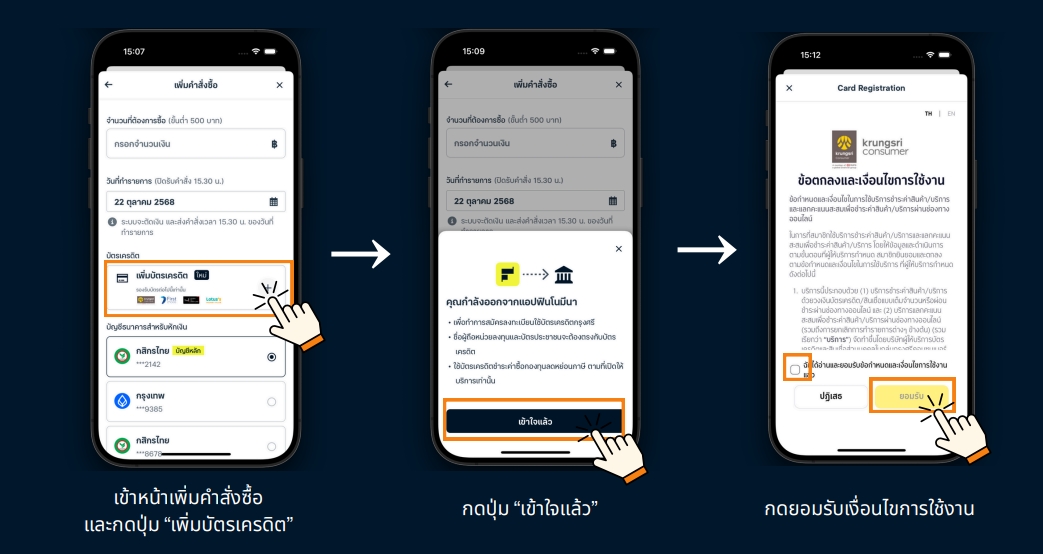 1. เริ่มต้นที่หน้าเพิ่มคำสั่งซื้อกองทุนรวม เลือก Tab “เพิ่มบัตรเครดิต” และทำการลงทะเบียนบัตร กดยอมรับข้อตกลงและเงื่อนไขการใช้งาน
