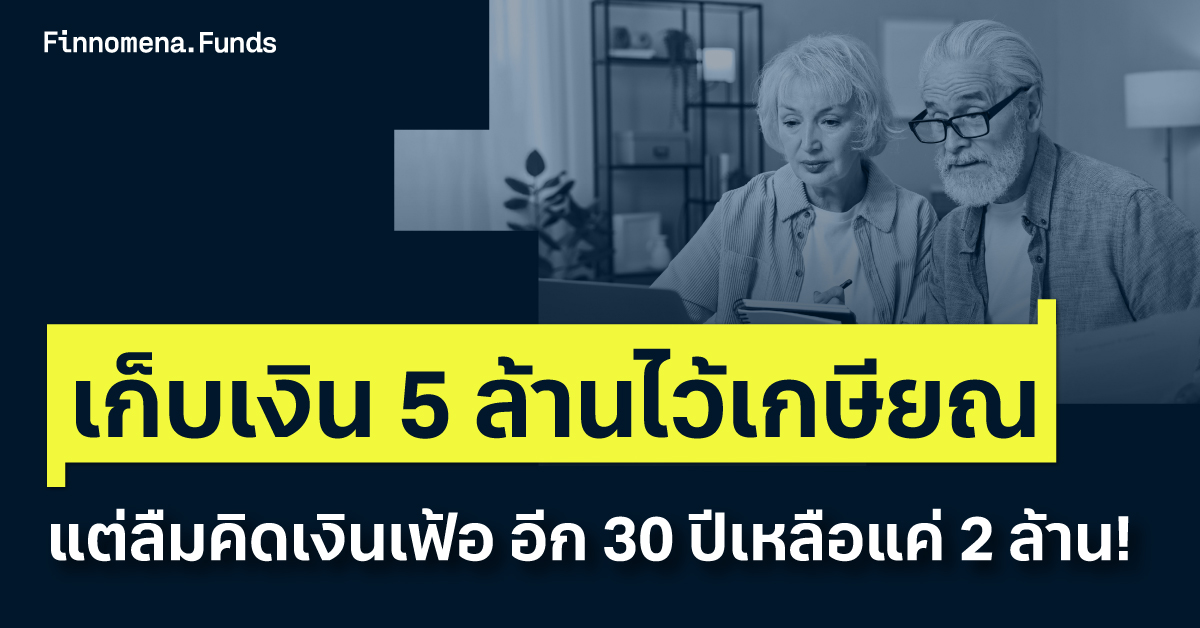 หลายคนวางแผนเกษียณโดยตั้งเป้าว่าขอมีสัก 5 ล้านก็พอแล้ว แต่รู้ไหมว่า ถ้าเงินเฟ้อกินปีละ 3% เงิน 5 ล้านในวันนี้ จะเหลือใช้จ่ายจริงแค่ 2.06 ล้าน ในอีก 30 ปี!