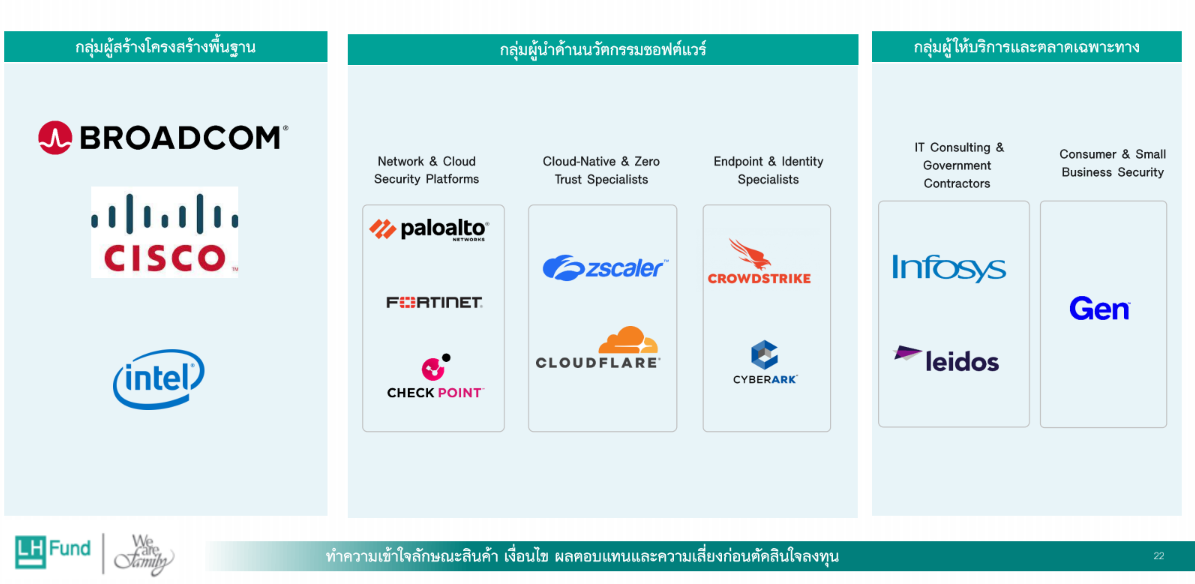 ความน่าสนใจ คือ การลงทุนแบบเฉพาะเจาะจง (Pure-Plays) ในกลุ่มบริษัทที่เป็นผู้นำด้านนวัตกรรมและมีศักยภาพเติบโตสูง ครอบคลุมทั้ง Value Chain ของอุตสาหกรรม ตั้งแต่ผู้สร้างโครงสร้างพื้นฐาน ไปจนถึงผู้นำแพลตฟอร์มและผู้เชี่ยวชาญเฉพาะทาง เพื่อให้ได้รับประโยชน์จากการเติบโตของอุตสาหกรรมความปลอดภัยทางไซเบอร์ทั้งหมด