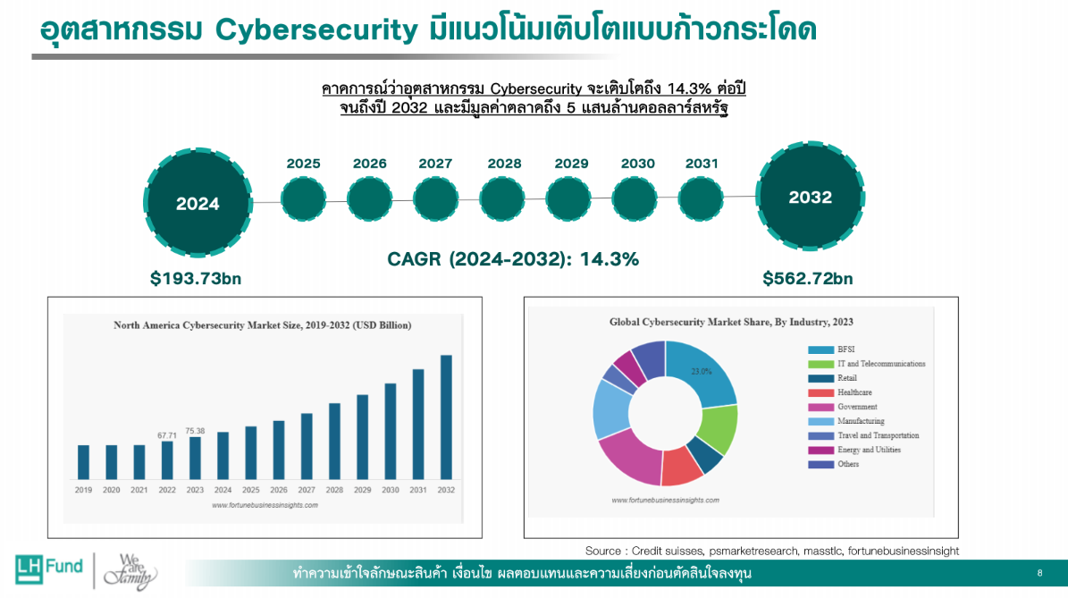 อุตสาหกรรม Cybersecurity จึงยังมีแนวโน้มที่จะเติบโตตามไปด้วย โดยคาดว่าอุตสาหกรรมนี้ทั่วโลกจะเติบโตเฉลี่ย 14.3% ต่อปี ตลอดปี 2024-2032 และคาดว่ามูลค่าตลาดจะสูงถึง 562.72 พันล้านดอลลาร์สหรัฐ ภายในปี 2032