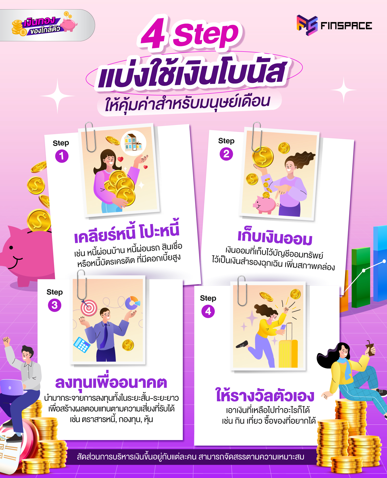 ซึ่งวันนี้ FinSpace มี 4 Step แบ่งใช้เงินโบนัส ให้คุ้มค่าสำหรับมนุษย์เดือน มาฝากกันครับ