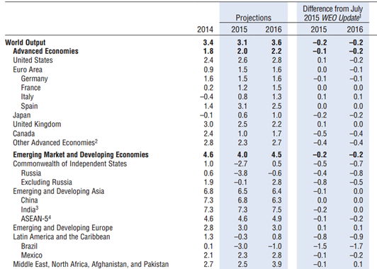 ในเดือนตุลาคม 2558 ที่ผ่านมา IMF ได้ปรับลดประมาณการเศรษฐกิจโลกในปี 2558 – 2559 ลง 0.2% โดยออกรายงานที่ชื่อว่า “Adjusting to lower commodities price” หมายถึงผลกระทบจากราคาโภคภัณฑ์ที่ตกต่ำต่อภาวะเศรษฐกิจโดยรวมของโลก อย่างไรก็ตามเห็นได้ชัดว่าตลาดหุ้นโลกกลับเพิกเฉยต่อข่าวร้ายด้านเศรษฐกิจพื้นฐาน แต่กลับปรับตัวเพิ่มขึ้นจากความคาดหวังว่าอเมริกาจะไม่ขึ้นดอกเบี้ย และคาดหวังว่าการกระตุ้นทางการเงินของยุโรป ญี่ปุ่น รวมถึงจีนจะมีอย่างต่อเนื่อง เช่นเดียวกับผลประกอบการไตรมาส 3 ของบริษัททั่วโลกที่ทยอยประกาศออกมาค่อนข้างแย่โดยเฉพาะสถาบันการเงินชั้นนำอย่าง Morgan Stanley, Goldman Sach, Deutsche Bank, Credit Suisse ฯลฯ แต่ปรากฎว่าตลาดหุ้นก็ยังปรับตัวเพิ่มได้ท่ามกลางข่าวร้ายนั้น