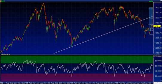ขณะที่ตลาดดูเริ่มจะลดการตอบสนองเชิงลบต่อข่าวร้ายเช่นการลดประมาณการเศรษฐกิจของ World Bank & IMF ในช่วงต้นเดือนตุลาคมที่ผ่านมา รวมไปถึงผลประกอบการไตรมาส 3 ของกลุ่มธนาคารและพลังงานที่ออกมาแย่ ตลาดกลับยังคงสามารถยืนบวกได้ต่อเนื่อง นอกจากนี้ยังมีกระแสเงินจากนักลงทุนสถาบันที่เข้าช่วยพยุงตลาดจากการซื้อกองทุน LTF และ RMF ในช่วงปลายปีเป็นปัจจัยบวกเพิ่มเติมอีกด้วยโดยเมื่อวิเคราะห์ปัจจัยพื้นฐานประกอบกับภาพทางเทคนิคคาดว่าตลาดหุ้นไทยจะฟื้นตัวได้ที่ประมาณ 1500 จุด และอาจปรับเพิ่มได้แรงถึง 1600 จุด ซึ่งแนะนำนักลงทุนให้ขายทำกำไรบางส่วนที่แนวต้าน เนื่องจากปัจจัยพื้นฐานสำคัญคือการเติบโตของกำไรของบริษัทจดทะเบียนยังไม่มีแนวโน้มที่ดีในปัจจุบัน เราจึงมองว่าตลาดหุ้นไทยไม่น่าจะทำจุดสูงสุดใหม่ของปีได้ในรอบนี้