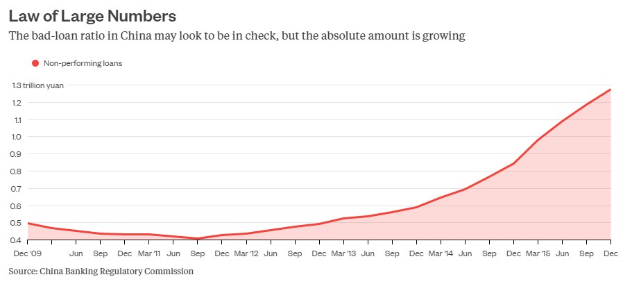 ไปเจาะลึกกันต่อที่ประเด็น NPL กันครับ ล่าสุด ณ สิ้นปี 2015 ตัวเลข NPL ในระบบธนาคารของจีนได้ปรับเพิ่มขึ้นจาก 1.25% เป็น 1.67% ถ้าคิดตามมูลค่านับเป็นการเพิ่มขึ้นถึง 51% ในปีเดียวมาที่ 1.27 ล้านล้านหยวน แต่หากรวมถึงหนี้ที่เริ่มส่งกลิ่นมีปัญหาหรือ Special Mentioned Loan ตัวเลขหนี้มีปัญหาของจีนจะสูงถึง 4.2 ล้านล้านหยวน หรือประมาณ 6.45 แสนล้านเหรียญสหรัฐฯ (ที่มา Bloomberg) เมื่อเทียบกับขนาดเศรษฐกิจหรือ GDP ของจีนที่ระดับ 10 ล้าน ๆ เหรียญ เท่ากับว่าหนี้มีปัญหาเพิ่มขึ้นมาถึงประมาณ 6% ของ GDP ไปแล้ว