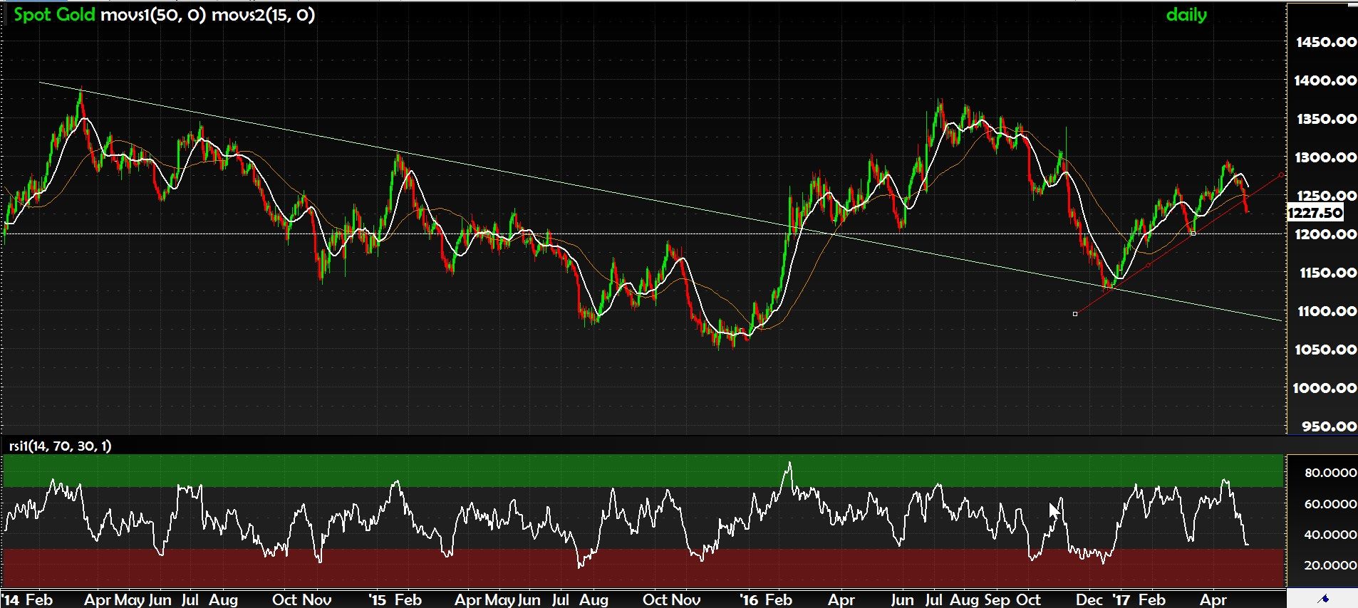 - ส่วนภาพ Technical ในภาพสุดท้าย แนวโน้มทองคำระยะยาว 1 – 2 ปียังดูเป็นขาขึ้นนับตั้งแต่ทะลุแนวต้านหลักในต้นปี 2016 ที่ผ่านมา (เส้นสีเขียว) โดยปัจจุบันถือเป็นขาขึ้น wave 3 แต่ในระยะสั้นทองคำลดทะลุแนวรับที่ 1250 ไปแล้ว (เส้นสีแดง) ถือว่าเป็นการปรับฐานที่โหดทีเดียว โดยเมื่อมองควบคู่กับปัจจัยพื้นฐานแล้วผมมองว่าทองคำไม่น่าจะหลุดแนวรับหลักต่อไปที่ 1200 $ (เส้นประสีขาว)