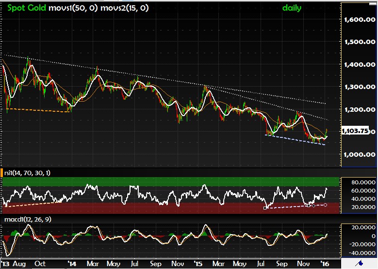 ผมวิเคราะห์ราคาทองเมื่อเดือนสิงหาคมปีที่แล้วอ่านได้ ที่นี่ ตอนนั้นมองว่าทองยังไม่น่าสนใจเท่าไหร่ แต่ ณ จุดนี้ เห็น Bullish Divergence (ดูสีฟ้า ราคาทองทำ lower low แต่ RSI ทำ higher high) เริ่มดูน่าสนใจมากขึ้นประกอบกับราคาทองดีดตัวในช่วงต้นปีที่ผ่านมาทำให้มีโอกาสค่อนข้างสูงที่จะไปทดสอบ 1150