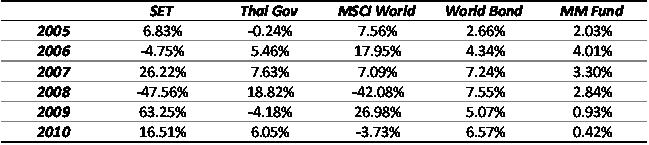 – Sharpe Ratio: ซึ่งสะท้อนถึงผลตอบแทนโดยปรับด้วยความผันผวนของราคา จากดีที่สุด ไปหาดีน้อยที่สุด คือ World Bond > Thai Bond > SET > World Equity > MM Fund