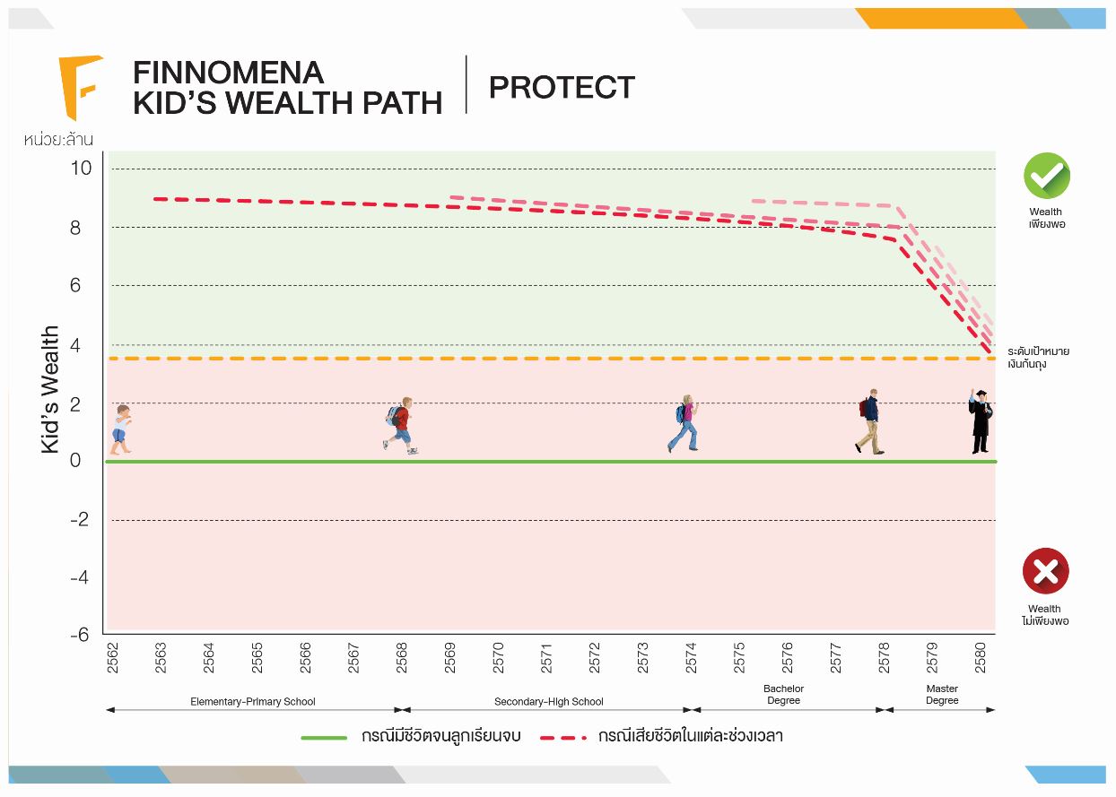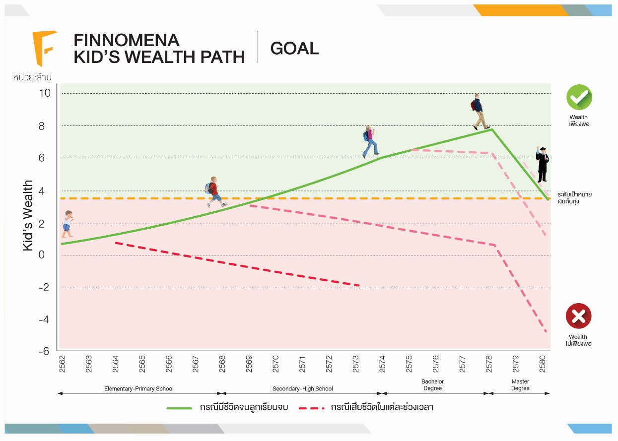 Kid’s Wealth Path จะแสดงให้เห็นประมาณการ Wealth ของเด็กตั้งแต่ปัจจุบันจนจบปริญญาโททั้ง 2 กรณี