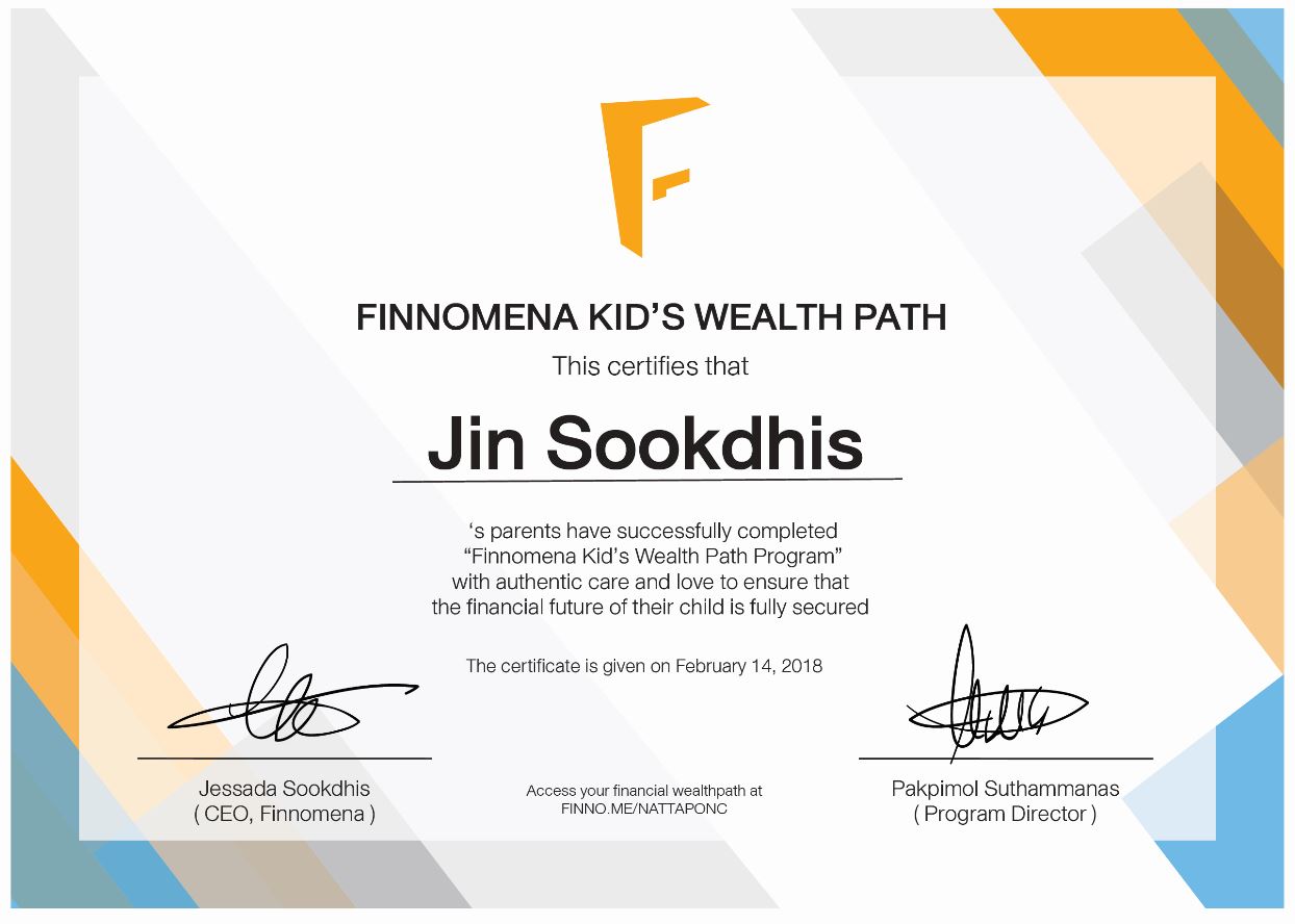 รูปที่ 5 Kid’s Wealth Path Certificate ของ ด.ช.จิณณ์ | ที่มา FINNOMENA
