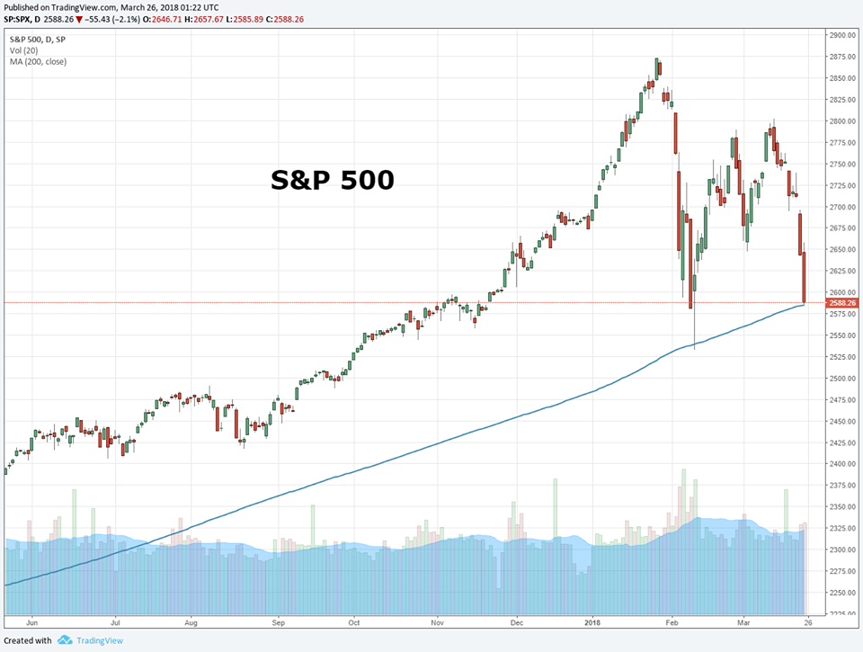 Chart of the week – S&P 500 ดัชนีหุ้นหลักทางสหรัฐฯ ปรับตัวลงถึง 7% นับจากวันที่ 12 มี.ค. ที่ผ่านมาลงมาจ่อที่เส้น MA200 วันซึ่งเป็นแนวรับทางจิตวิทยาที่สำคัญ ท่ามกลางปัจจัยลบเรื่องสงครามทางการค้าที่เปิดฉากโดยสหรัฐฯ ปัญหาข้อมูลรั่วไหลของ facebook ขณะที่การประชุม FED ผ่านไปได้ด้วยดีคือไม่มีสัญญาณการรีบเร่งการขึ้นดอกเบี้ยเร็วกว่าเดิม ขณะที่มุมมองเงินเฟ้อก็ไม่ได้เร่งตัวขึ้นอย่างที่ตลาดกลัวในช่วงก่อนหน้า
